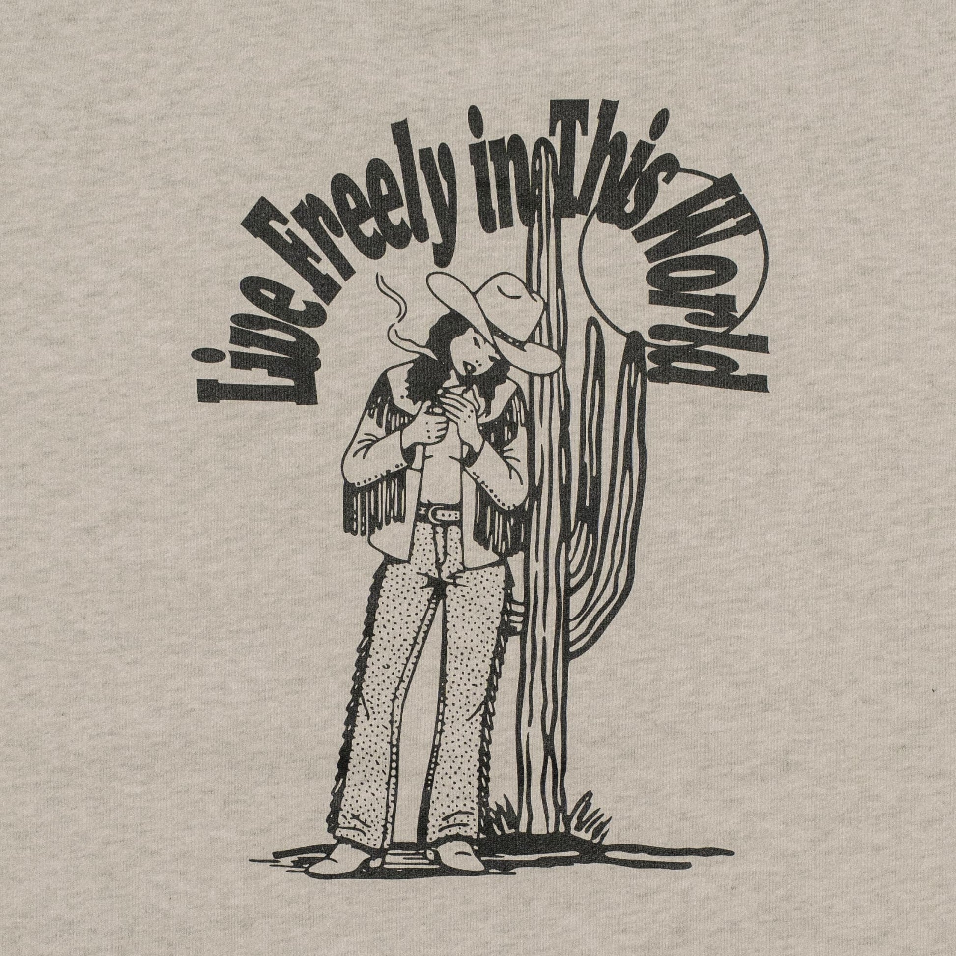砂漠に佇むカウガールを描いた、どこか物語を感じさせる一枚。